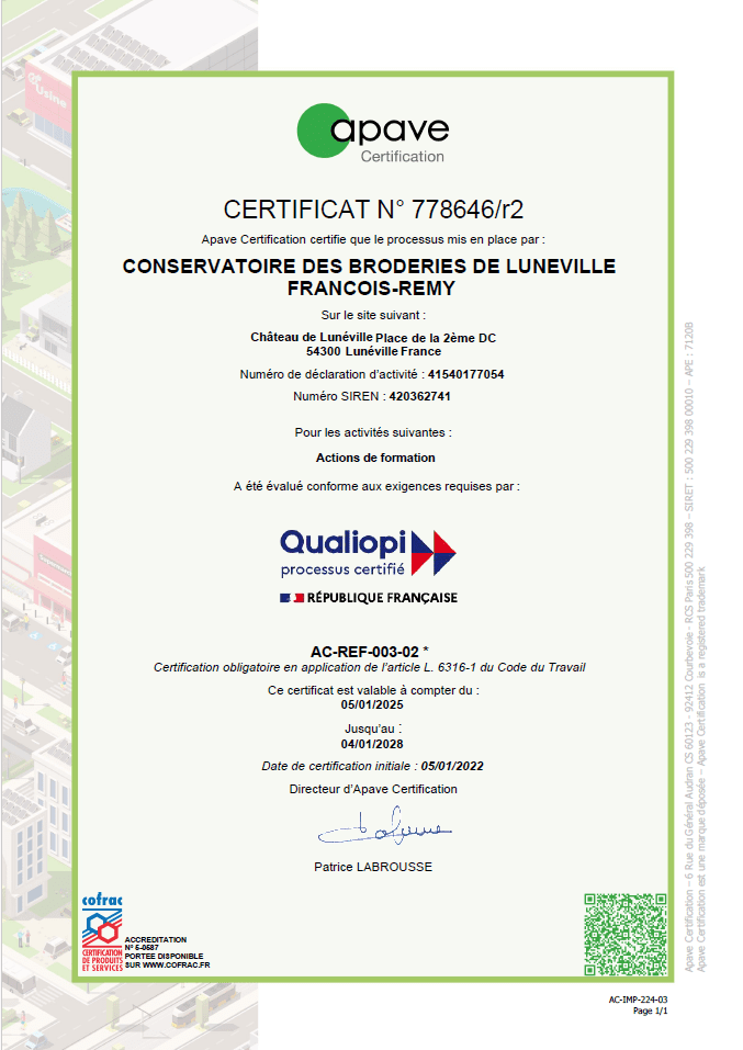 Depuis le 29 Avril 2025, le Conservatoire des Broderies de Lunéville a reçu sa certification professionnelle au Registre Spécifique auprès de France Compétences pour