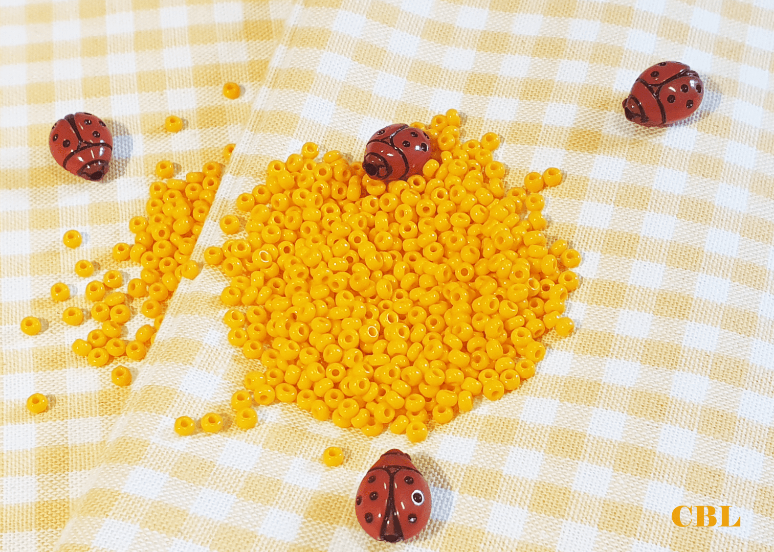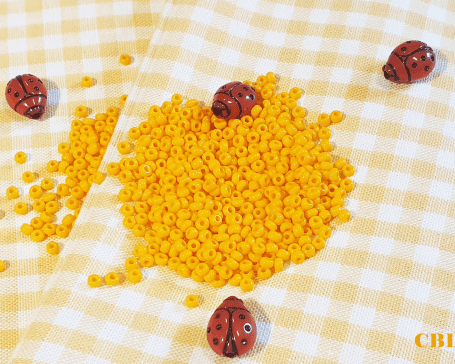 Ce lot contient : une paire de tire-bords en coton vichy (outil indispensable pour monter son métier à broder), un sachet de perles orangées et 4 pièces d'ornements "Coccinelle".